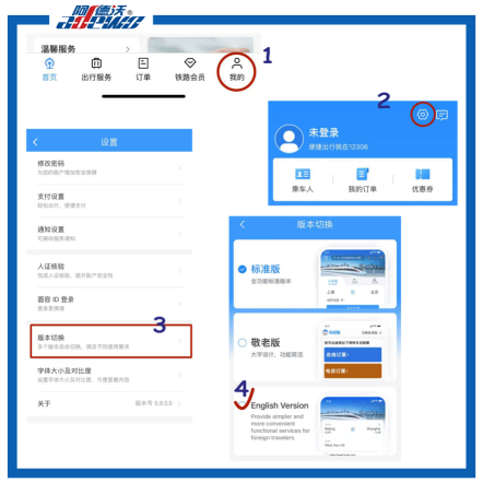 Download 12306 app, pindhah menyang "kula (ing sisih ngisor) →" Setelan "→" Versi Switch "→ Pilih Inggris Toswitch menyang Versi Inggris.