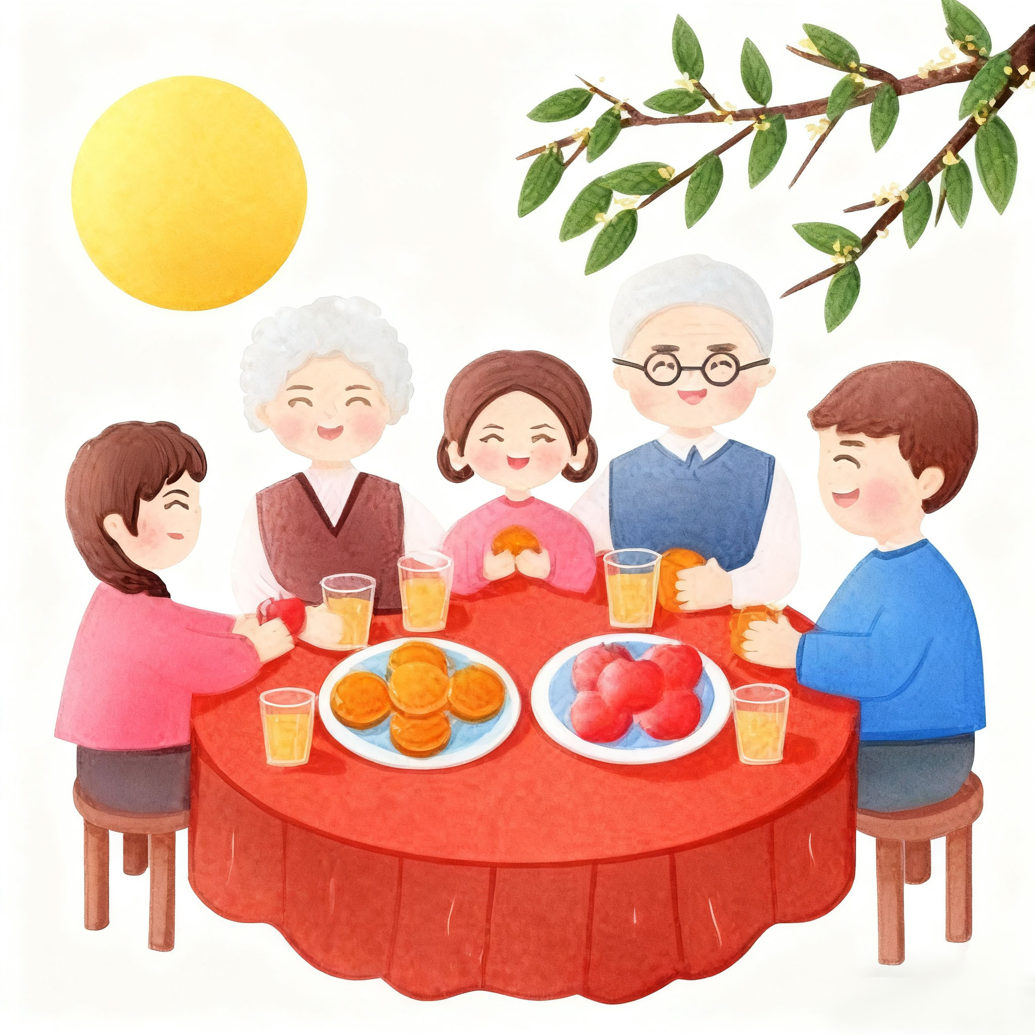 Kulawarga kumpul kanggo ngujo bulan purnama sing cerah, nglambangake reuni lan rasa seneng.